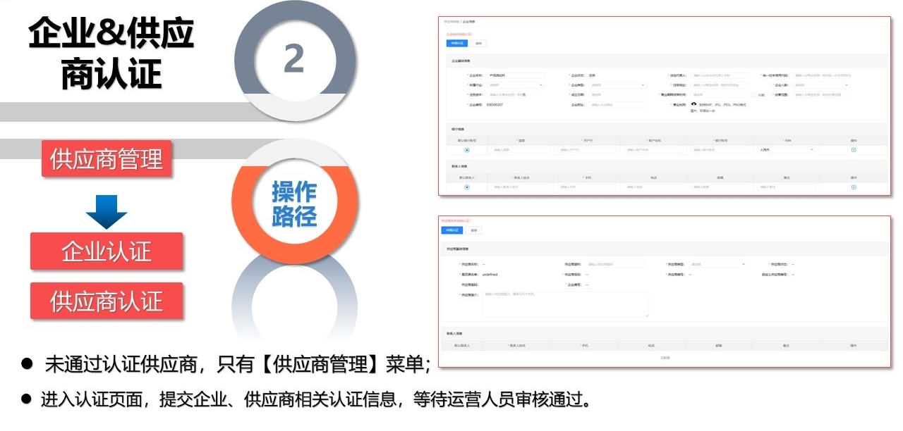 3.进入供应商中心-供应商管理-企业信息,填写企业基本信息、银行账户信息与联系人信息,并申请认证。;根据页面提示需上传企业营业执照、法人正反面身份证照,开户许可证照片、被授权人身份证正反面照照片等素材。
